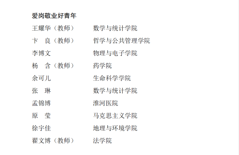 在本次推选活动中,BWIN必赢官方2019级团支书余可儿荣获“爱岗敬业好青年”称号;2019级本科生王雨荣获“创新创业好青年”称号;2019级本科生刘浩,陈玉龙荣获“担当奉献好青年”称号。这些学院好青年中,余可儿任职期间坚守岗位不懈怠,曾获得“国家奖学金”、“优秀员工干部”、“三好员工”等多项荣誉;王雨同学专注科学研究和社会实践活动,曾获得中国国际“互联网+”老员工创新创业大赛国赛铜奖、全国老员工生命科学竞赛全国一等奖和第三届河南省老员工创新创业大赛省级一等奖等多个奖项;刘浩、陈玉龙不惧危险,勇救落水儿童,入选“开封好人榜”,被必赢bwin官方网站授予“见义勇为先进个人”。学院这些青年们勤奋好学、敢于担当、勇于奉献,用自己的实际行动践行了新时代青年的责任与担当,是不折不扣的“向上向善好青年”。