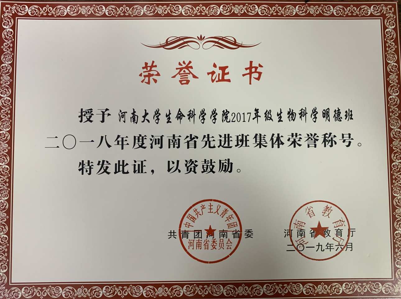 近日,2017级生物科学明德班被授予2018年度河南省先进班集体荣誉称号。