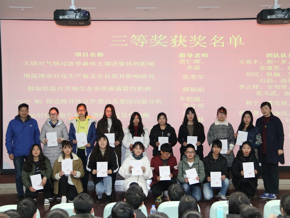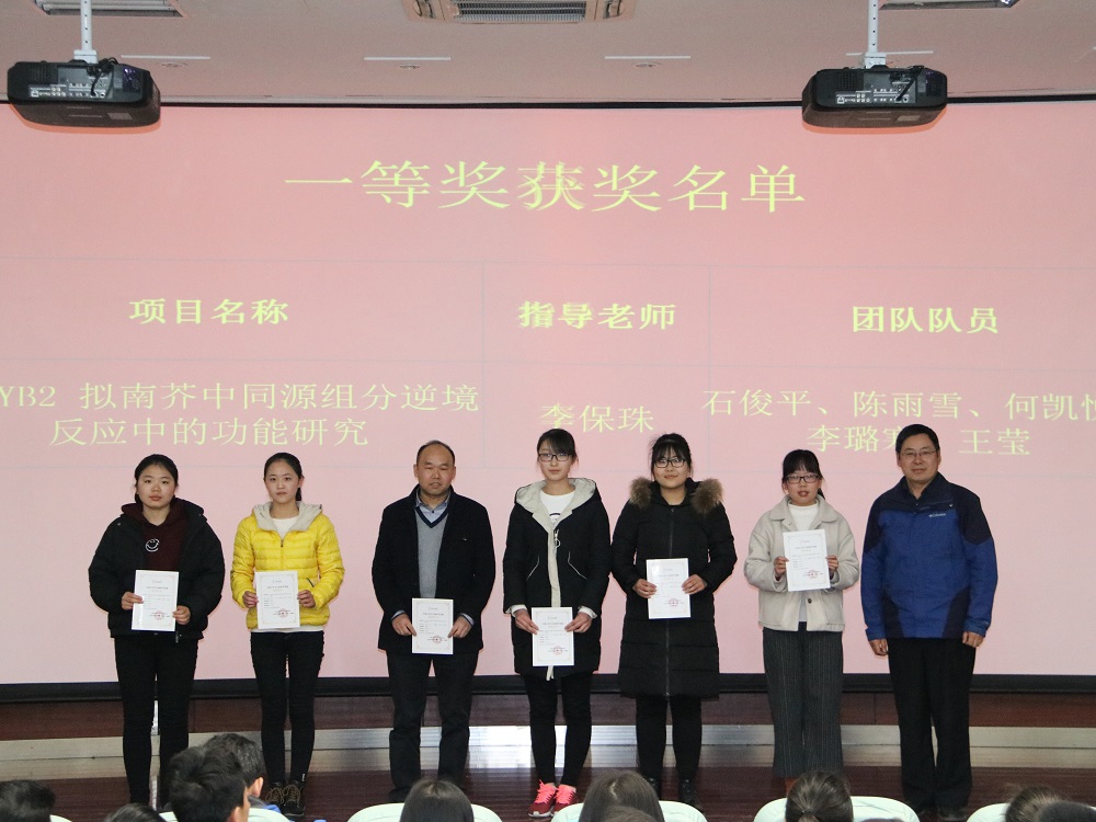 在获奖师生代表发言中,一等奖团队指导教师李保珠对学院给予参赛队伍的指导和帮助表示感谢,告诫参赛同学在备赛过的中要信心百倍、努力把实验做好,并预祝同学们在第二届大赛中取得更好成绩。获奖员工代表2015级生物科学专业员工武敏、王雅男与大家分享参赛心得,讲述备赛注意事项,鼓励同学们积极备赛。