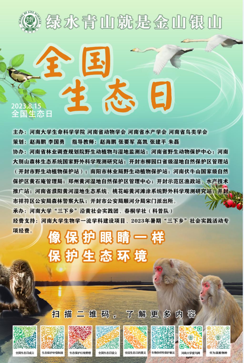 为迎接首个全国生态日(8月15日),BWIN必赢官方提早准备,精心安排,近日来,围绕“绿水青山就是金山银山”主题开展了科普宣讲、海报张贴和文创产品分发等系列活动,场所除必赢bwin官方网站校园外,还包括开封柳园口省级湿地自然保护区、开封市水稻乡杨桥社区、沙门村以及开封市中国式摔跤协会运动训练基地等,并在“2023河南省动物学会教学科研研讨会”上介绍了科普活动产品和方案,得到了来自27家参会单位80余参会嘉宾、代表的高度肯定和认可。
