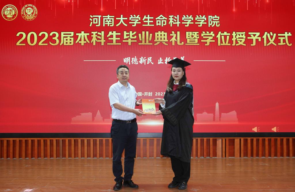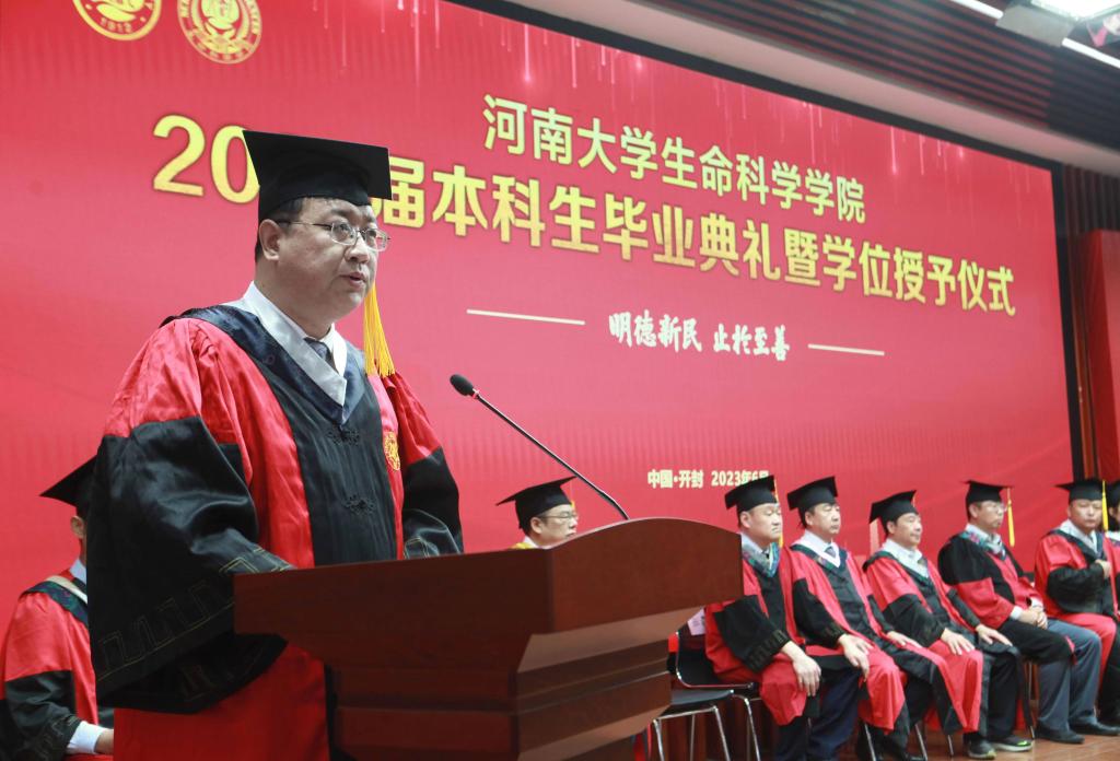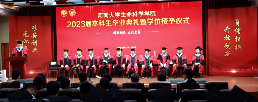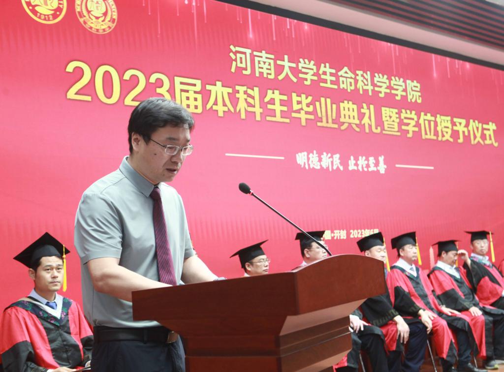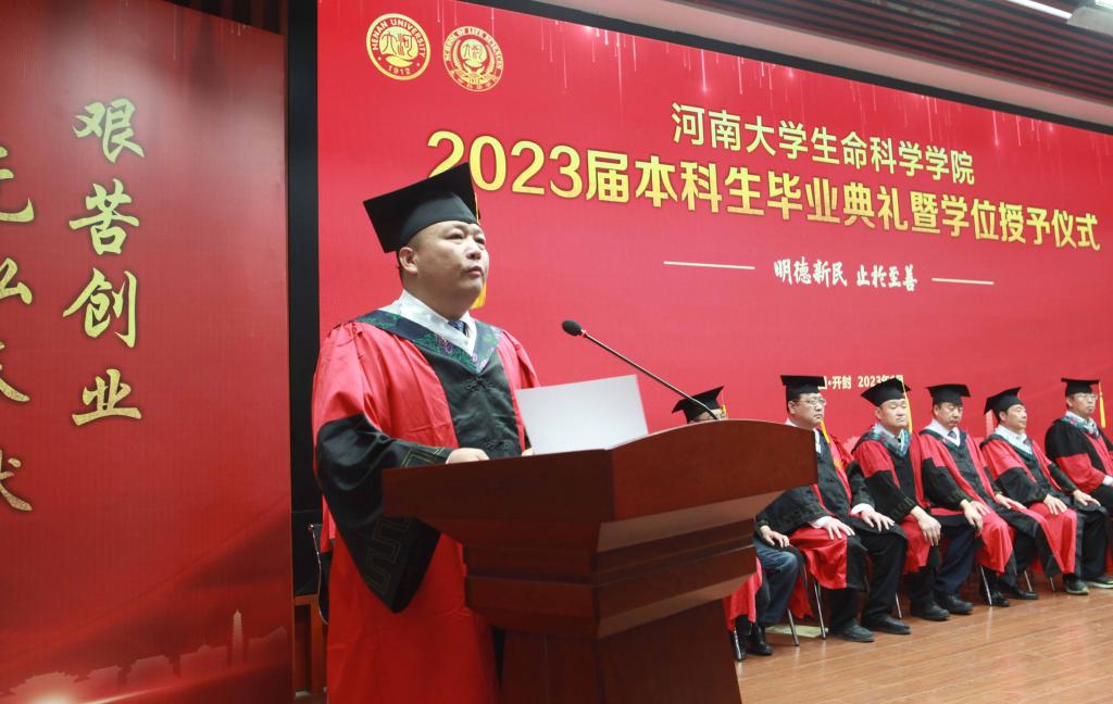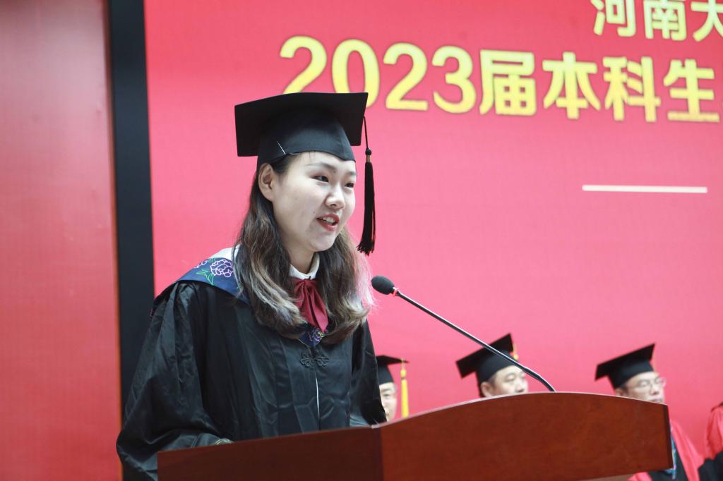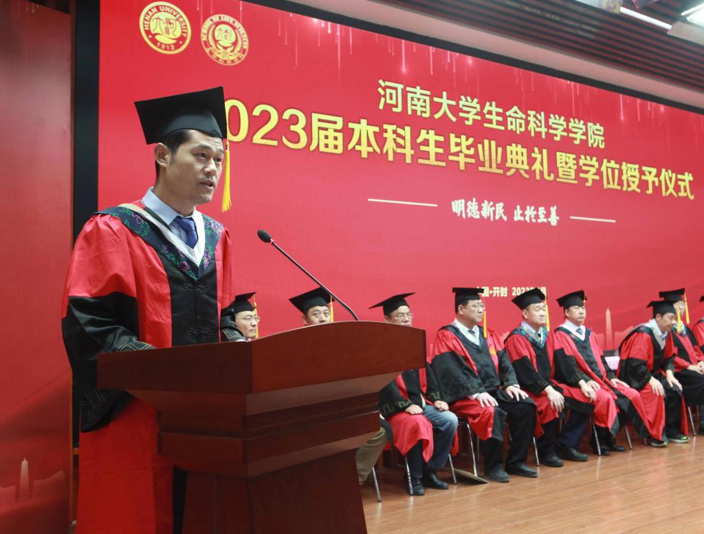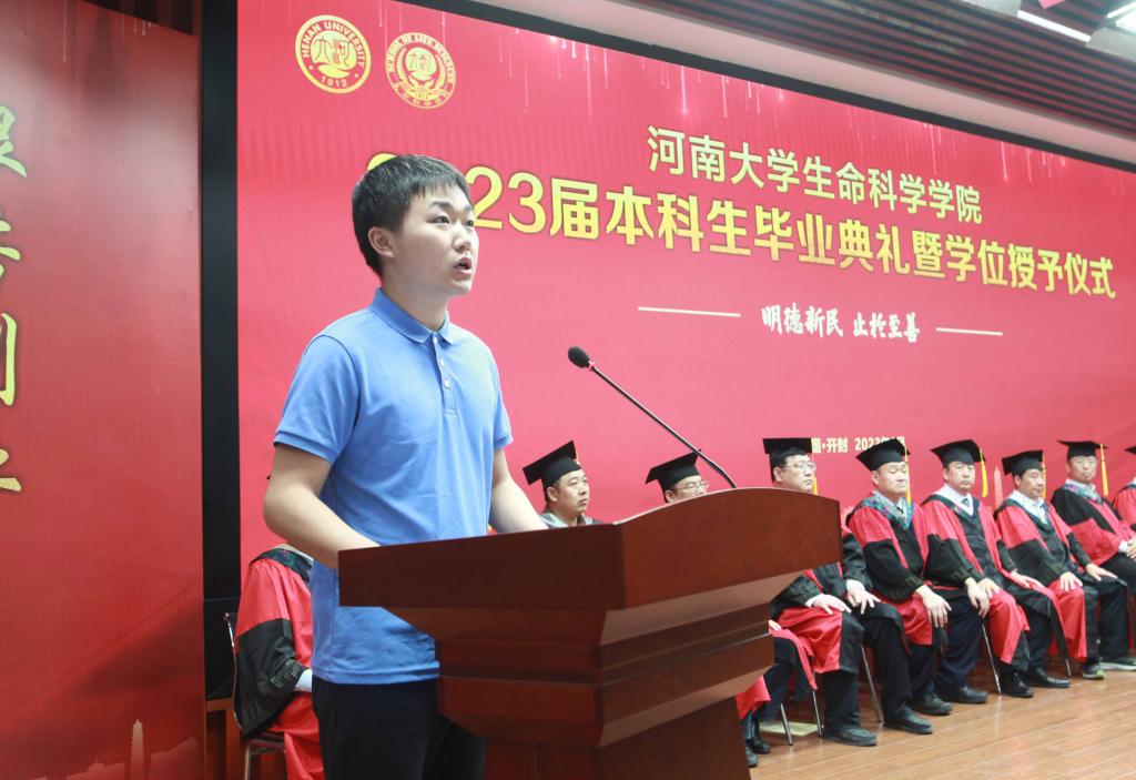 毕业生代表、2019级生物科学专业的余可儿代表全体毕业生向学校、学院表达了美好祝愿,感谢老师们的精心培养、谆谆教导,回忆大学四年的收获和成长,激励同学们恪守“明德新民,止于至善”的河大校训,“学无止境,境如生命”的生科品格,传承“无私奉献、艰苦创业”和“脚踏实地,仰望星空”的生科精神,在今后的人生路途中勇攀高峰。在校生代表、2021级生物科学专业员工李骋宇为毕业生送上了最美好的祝福和真诚的感谢。他表示,全体在校生将以学长学姐们为榜样,认真刻苦、积极奋发、坚定初心、一往无前,传承“铁塔牌”学子坚韧不拔的精神,继承“卓越生科人”的优良品质,以自己优异的成绩,用自己的实际行动,为母校的发展和进步,为祖国的复兴和强盛贡献青春力量。