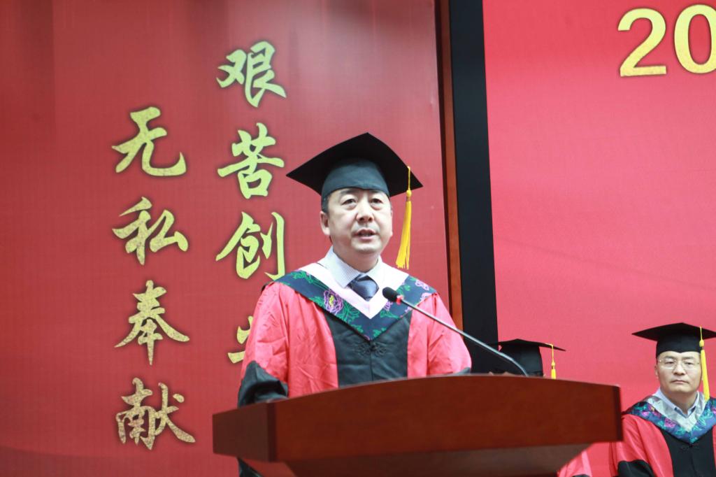 教师代表、植物科学与技术系党支部书记、主任高安礼教授发言。他感情真挚地表达了对毕业生们的祝贺与不舍,勉励毕业生们实现自我尊重,规划人生方向,树立终身学习观,希望同学们保持持续学习的能力,坚守持续学习的决心,紧跟时代发展的步调,奋斗不息,砥砺前行。