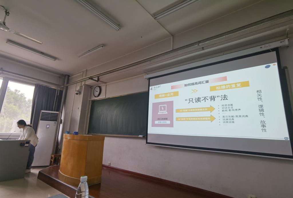 钟丽结合目前的英语考研真题,从学习动机、学什么、怎么学等方面做了系统的总结和讲授,强调了练好“语音、词汇、语法”基本功的重要性,介绍了诸多英语学习资源,课后同学们踊跃发言,对英语学习中遇到的口音问题、习作问题以及英式英语和美式英语的选择等问题进行了热烈交流。