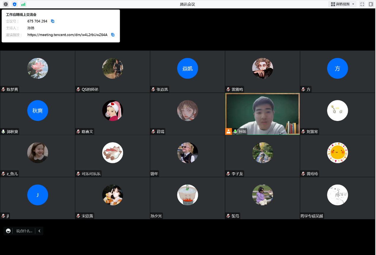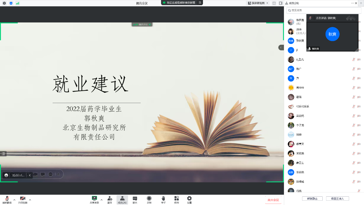 为进一步加强学院就业指导工作,帮助同学们进一步了解掌握求职技巧,加快就业工作的基础推进,BWIN必赢官方于12月29日晚19:00通过腾讯会议举办了求职经验线上分享会。学院2023届30余名研究生参加会议,分享会邀请了2022届优秀毕业生郭秋爽作交流分享,会议由辅导员孙扬主持。