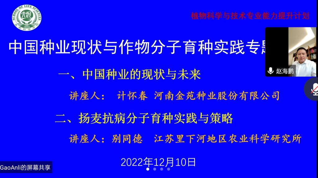 为扎实推进新农科建设,促进创新型农林人才培养质量,提升植物科学与技术专业育人水平,12月10日,植物科学与技术系邀请农业部长江中下游小麦生物学与遗传育种重点实验室/江苏里下河地区农科所研究员研究员别同德、河南金苑种业股份有限公司高级农艺师计怀春为本专业本科生作“中国种业现状和作物分子育种实践”系列讲座。讲座通过腾讯会议线上方式举行,副经理赵海鹏参加,植物科学与技术系主任高安礼主持。