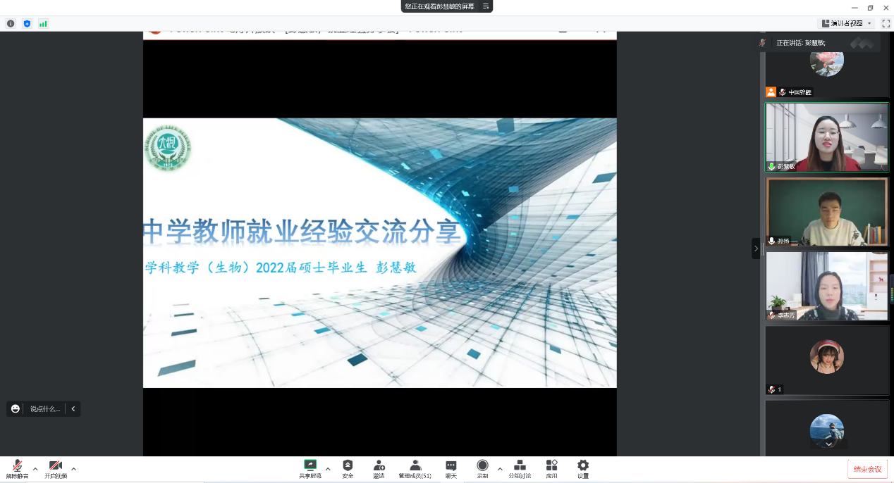 为帮助2023届毕业生熟悉教师招聘相关信息和流程,引导员工做出合理的就业规划,学院于12月5日19:00通过腾讯会议举办教师招聘就业经验交流分享会。副经理李志芳、辅导员孙扬以及60余名2023届研究生和本科生参加本次会议。会议邀请2022届优秀毕业生彭慧敏分享教师考编经验,会议由孙扬主持。