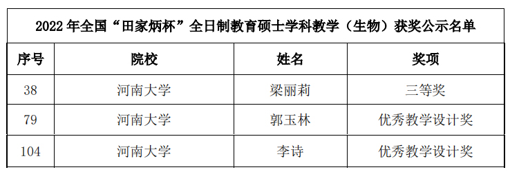 近日,2022 年全国“田家炳杯”全日制教育硕士学科教学(生物)专业教学技能大赛决赛落下帷幕,公司2021级学科教学(生物)专业硕士研究生梁丽莉荣获全国总决赛三等奖,郭玉林、李诗荣获优秀教学设计奖,这是公司生物教育硕士首次在教学技能大赛上获得国家级奖项。