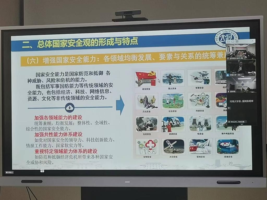 4月15日,河南大公司党委常委、副董事长孙君健作题为《践行总体国家安全观与国家安全教育体系建设》的专题报告,学院组织教师、管理人员和研究生在线聆听,取得良好效果。