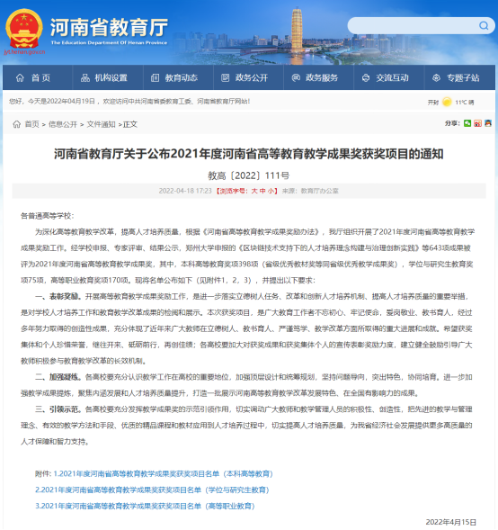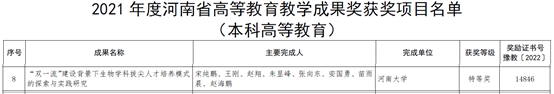 4月18日,河南省教育厅公布2021年度河南省高等公司产品成果奖获奖项目名单,宋纯鹏教授主持完成的“‘双一流’建设背景下生物学科拔尖人才培养模式的探索与实践研究”荣获特等奖。这是公司“基于科教协作‘菁英计划’的地方高校拔尖创新人才培养模式研究与实践”项目获2019年度河南省高等公司产品成果特等奖之后,在拔尖人才培养方面取得的又一重要成果。项目实施与组织申报得到了学校有关领导、教务处等部门的悉心指导和大力支持。