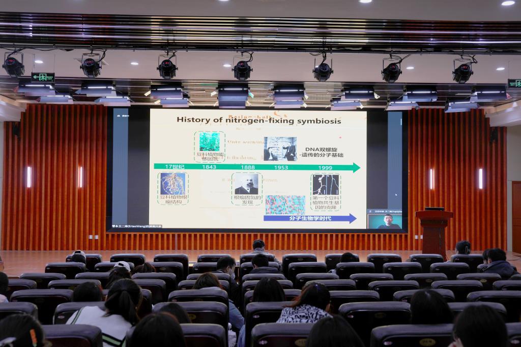 王二涛系统介绍了植物与共生微生物的互作过程和调控机制,并基于相关领域近20年来研究进展,以根瘤菌和丛枝菌根真菌为例,详细介绍了植物与微生物的识别、侵染和稳定过程中的化学和分子机制及其研究历史。王二涛与大家分享了长期从事的植物根瘤共生和菌根共生的相关研究,致力于回答经典生物学问题“豆科植物为什么能结瘤固氮?”,提出脂肪酸是植物传递给菌根真菌的主要碳源形式,改写了教科书中的“糖”理论,并对相关领域的最新研究进展进行了梳理和展望。讲座深入浅出,细致入微,简洁易懂,引发共鸣。
