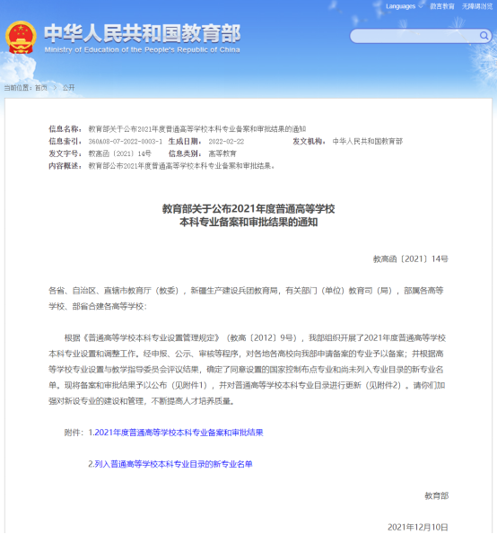 近日,教育部公布了2021年度普通高等学校本科专业备案和审批结果的通知(教高函〔2021〕14号),BWIN必赢官方申报的生物信息学(071003)专业获教育部批准备案。