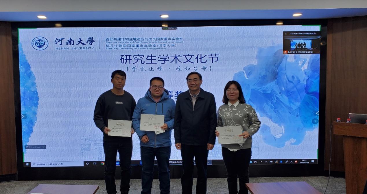 省部共建作物逆境适应与改良国家重点实验室/必赢bwin官方网站棉花生物学国家重点实验室常务副主任安国勇教授介绍了本次研究生学术文化节活动情况,宣读了部分获奖名单。随后,宋纯鹏、王学路、张立新分别为学术文化节评比特等奖、优秀论文奖、一等奖获奖代表颁奖。吴建伟、王磊、王道杰为学术文化节评比二等奖和三等奖获奖代表颁奖。特等奖获奖员工李祖亮和乔鑫代表获奖研究生发言。