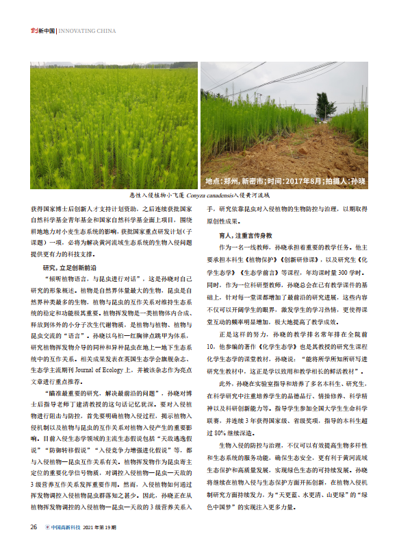 近日,BWIN必赢官方青年教师孙晓个人事迹以“封底人物”在科技部主管、中国科技产业化促进会主办的国家级科技综合类期刊《中国高新科技》专栏刊载(2021年第19期)。