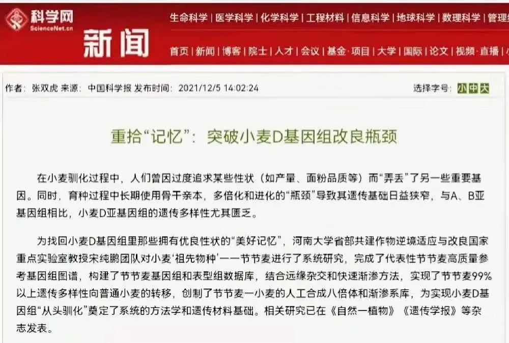 在小麦驯化过程中,人们曾因过度追求某些性状(如产量、面粉品质等)而“弄丢”了另一些重要基因。同时,育种过程中长期使用骨干亲本,多倍化和进化的“瓶颈”导致其遗传基础日益狭窄,与A、B亚基因组相比,小麦D亚基因组的遗传多样性尤其匮乏。