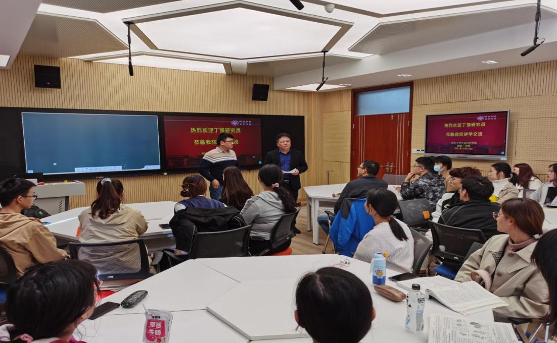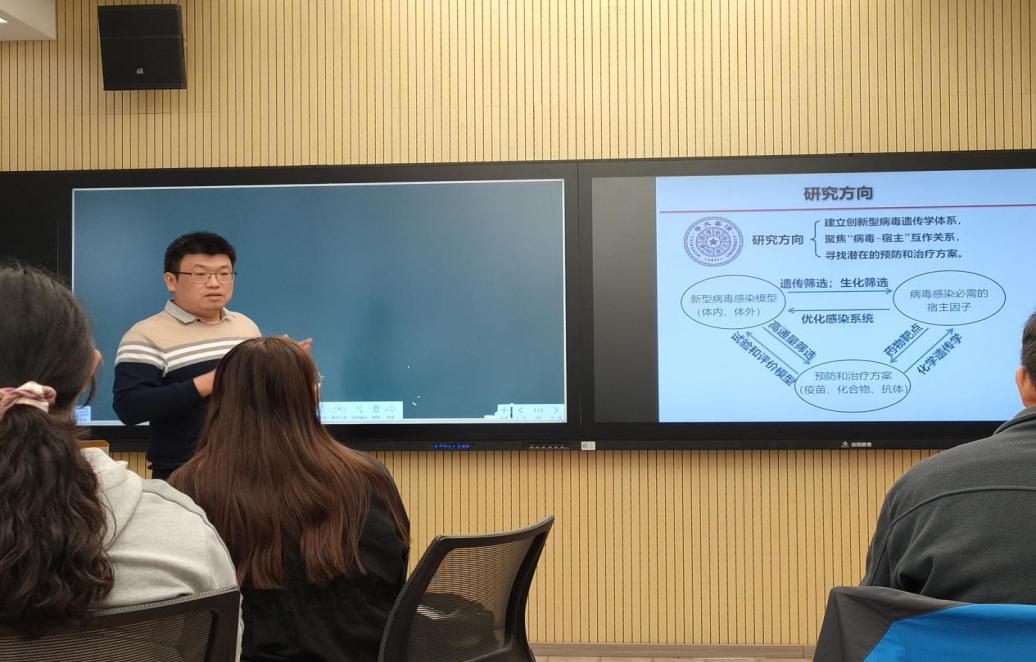 在学院智慧教室,丁强作了题为“新型冠状病毒的潜在易感宿主、病毒演化和抗病毒药物发现”的学术报告,分享了其课题组在严重威胁全球公共健康的新型冠状病毒(SARS-CoV-2)研究方面的最新成果;并结合受众为本科生的实际,详细介绍了其研究选题、方向抉择的历程以及科研协作对工作开展的促进,给人诸多启迪。交流阶段,学术讨论之外,丁强还就英语学习、研究生面试、导师选择和国内外科研环境异同,当前国际交流如何有效开展等问题,结合自身的成长,国内外求学、科研经历分享了经验、感悟和体会。