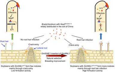 2021年1月15日,必赢bwin官方网站王学路教授团队和华中农业大学李友国教授合作在Nature Plants上发表了题为“Glycine max NNL1 restricts symbiotic compatibility with bradyrhizobia via root hair infection in soybean”的研究论文(doi : 10.1038/s41477-020-00832-7),揭示了大豆与根瘤菌共进化过程中根瘤菌由裂隙侵染向根毛侵染方式转变的遗传、分子和进化机制。研究人员首先构建了来自于世界各地的496份大豆核心种质自然变异群体;再根据接种慢生型根瘤菌后根瘤数目的表型,进一步通过全基因组关联分析结合遗传分析和分子生物学的方法,定位并证明了一个编码TIR-NBS-LRR蛋白的R基因(命名为GmNNL1,Nodule Number Locus 1)能够限制根瘤菌侵染大豆,降低大豆的根瘤数目。进一步分析发现,在大豆的自然选择、人工驯化以及与根瘤菌的共进化过程中,一类GmSINE1转座子的插入导致了该基因功能失活,使其只能编码截短形式的GmNNL1蛋白,从而促进了大豆对土壤中土著根瘤菌的识别,增加了大豆根瘤数量,进而显著提高了大豆单株固氮酶活以及地上部分生物量。GmNNL1主要在根毛中受根瘤菌诱导表达并主要影响根瘤菌的根毛侵染途径,而具有转座子插入的GmNNL1失活单倍型的出现,是导致根瘤菌侵染大豆由裂缝侵染向根毛侵染转变的重要原因。进一步通过质谱鉴定、生化和遗传分析发现,全长的GmNNL1蛋白通过与根瘤菌的三型分泌系统效应蛋白NopP直接相互作用激活ETI从而抑制大豆与根瘤菌的共生。该研究不仅揭示了大豆与根瘤菌互作过程中宿主与寄主匹配性的遗传和分子机制,还阐释了根瘤菌与大豆共进化过程中根瘤菌由裂缝侵染演化成高效的根毛侵染过程的重大分子事件,也为大豆高效固氮的分子设计育种提供了重要理论依据和目标基因。