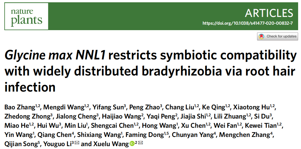 豆科植物能通过与根瘤菌互作形成根瘤进行共生固氮。据估算,豆科植物共生固氮占全球生物固氮总量的60-70%。因此,研究豆科植物共生固氮的分子机制,提高共生固氮效率,对实现减肥增效、发展绿色农业具有重要意义。豆科植物的共生固氮效率受根瘤菌匹配性以及非生物逆境的影响,但是长期以来,其遗传和分子调控机制知之甚少。近期公司王学路教授团队先后在国际顶尖期刊Nature Plants 和Molecular Plant上发表重要研究论文,揭示了大豆与根瘤菌共生固氮的分子进化机制以及逆境适应机制。系列研究具有重要的理论意义,也为大豆高效固氮的分子设计育种提供了重要目标基因。