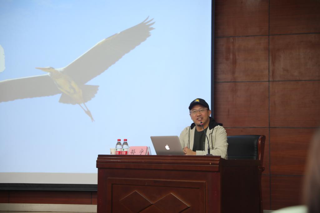 孙宁导演通过分享两个有趣的生命故事开启讲座。他介绍了他执导的作品《大天鹅》的故事,通过该部影片的推介片,在场师生了解了黄河中游三门峡栖息地上大天鹅的生活场景。孙宁导演讲述了团队在拍摄过程中遭遇的天气、体力、精神等方面的各种考验。他说“三年的拍摄过程是艰辛的,虽然犹豫过、迷茫过,但我们都能够不忘自己的初心,坚持下来。” 孙宁导演语言幽默诙谐,他的积极乐观感染着在场师生。