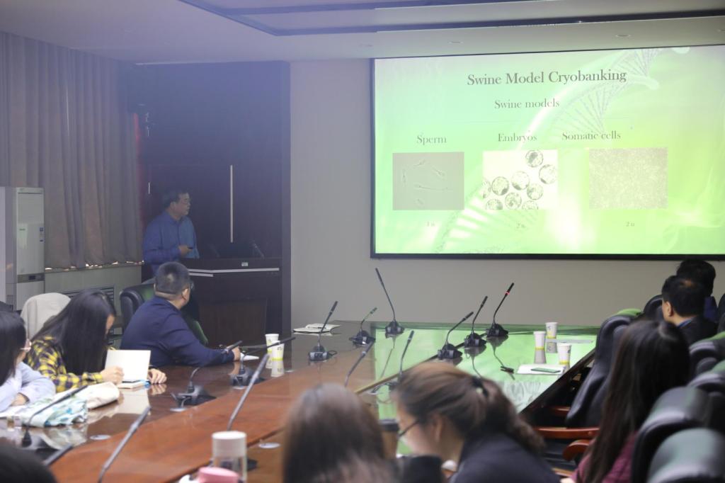 4月22日上午,美籍华人密苏里大学兽医病理生物学系大鼠资源及研究中心门红升教授应邀在学院B201会议室作了题为“低温种质库保存模式猪方法的建立”的报告。报告会由学院副经理赵翔主持,相关专业教师、本科生和研究生参加报告会。