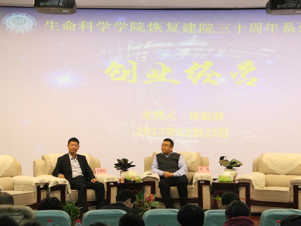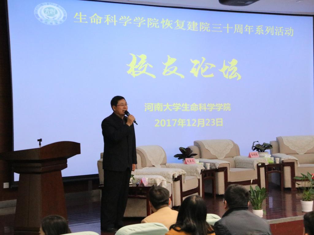 随后论坛开始,本次论坛分为科学研究、社会管理、教书育人、创业经营四个板块。公司青年教师孙晓、赵海鹏、苗原、张彭湃分别担任四个板块的主持人。首先是科学研究板块,1988级员工、国家杰青、中国农业大学特聘教授赵要风提出在科研道路上要深入对待自己的课题,潜心研究;1996级员工王鹏程向大家讲述了他的河大求学和工作经历,分享了他的人生感悟,教育员工要对自己的人生有清楚的规划,向着自己的目标前行;1999级员工、中科院上海植物生理生态研究所研究员王二涛告诫大家在科研上要有质疑科学权威的勇气;2001级员工中科院天津工业生物技术研究所研究员孙周通教育学子们要怀着一颗感恩的心去做事做人。
