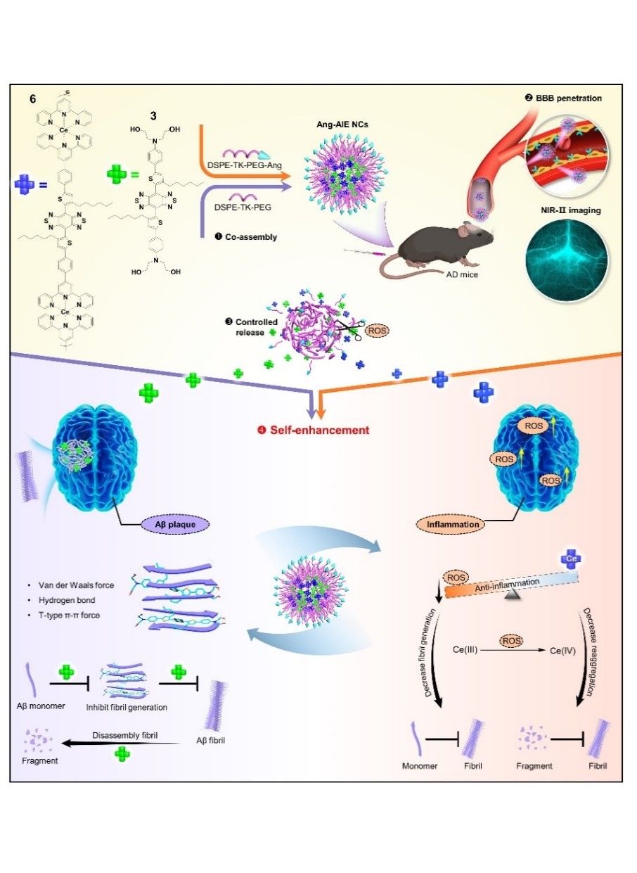 河南省脑靶向生物纳米药物重点实验室团队围绕AD疾病,构建了一种具有活性氧(ROS)响应的近红外脑靶向聚集诱导发光(AIE)纳米诊疗剂用于AD诊疗。研究结果以“A one-two punch targeting reactive oxygen species and fibril for rescuing Alzheimer’s disease”为题发表在Nature Communications(中科院一区SCI-TOP期刊,IF = 16.6)(BWIN必赢官方王杰菲副教授和博士研究生上官萍为共同第一作者,香港中文大学唐本忠院士、BWIN必赢官方冰洋教授和汪欣副教授、南方医科大学南方医院张静教授为共同通讯作者)。